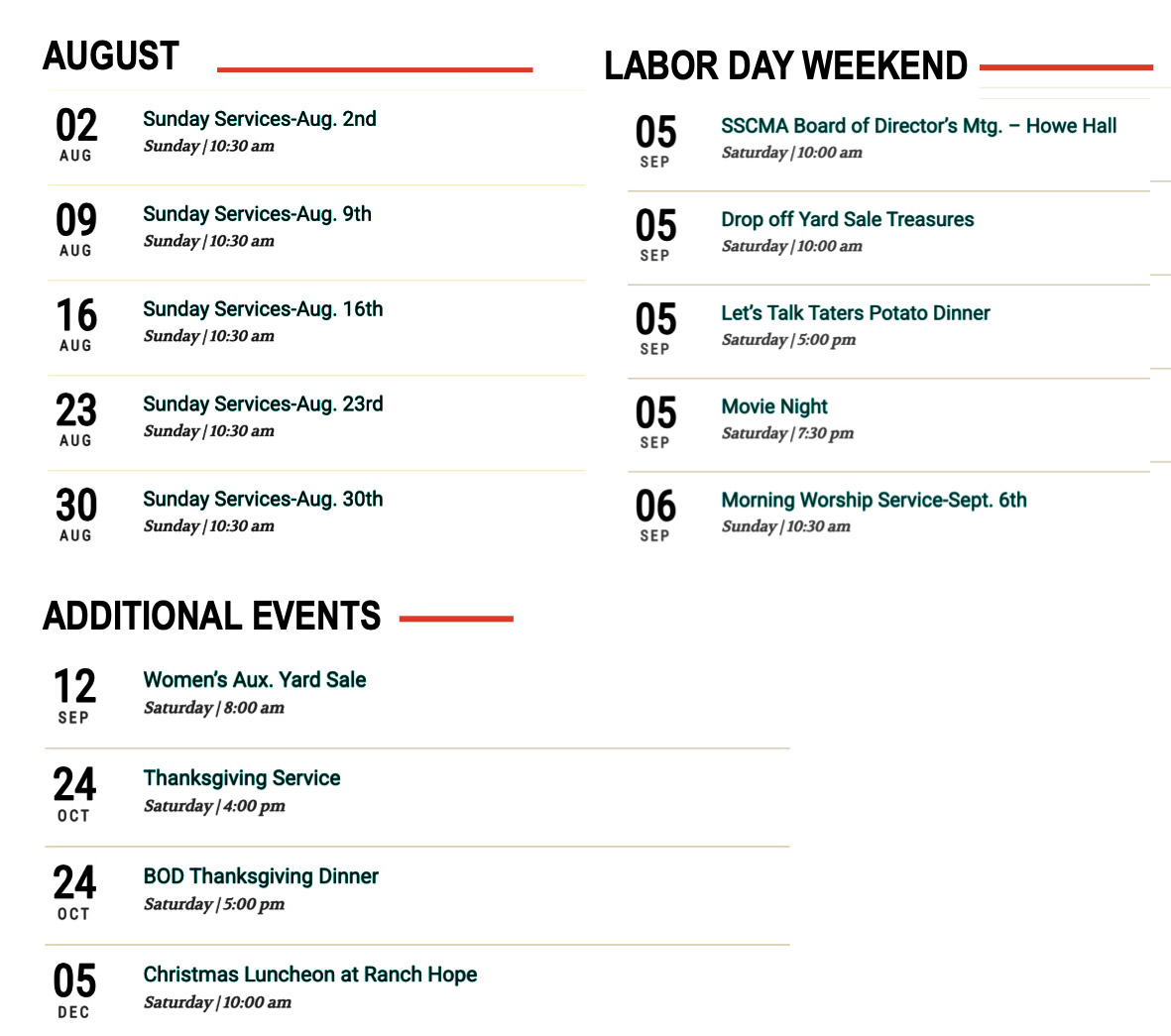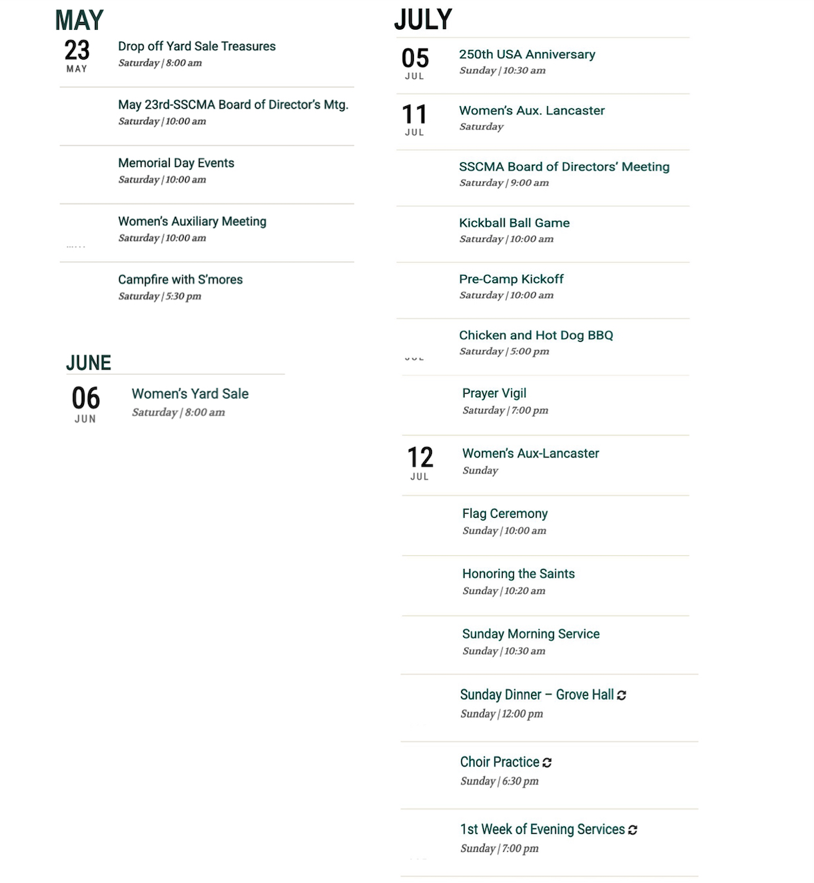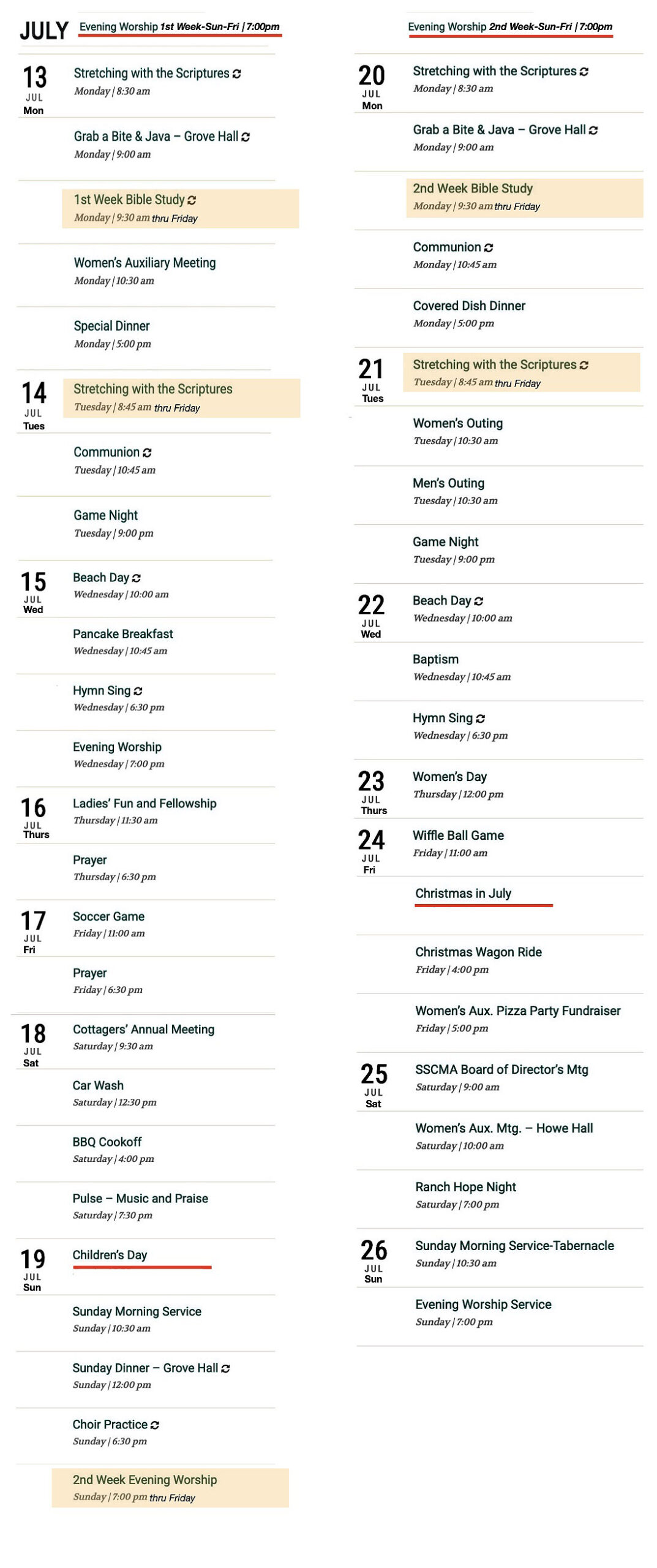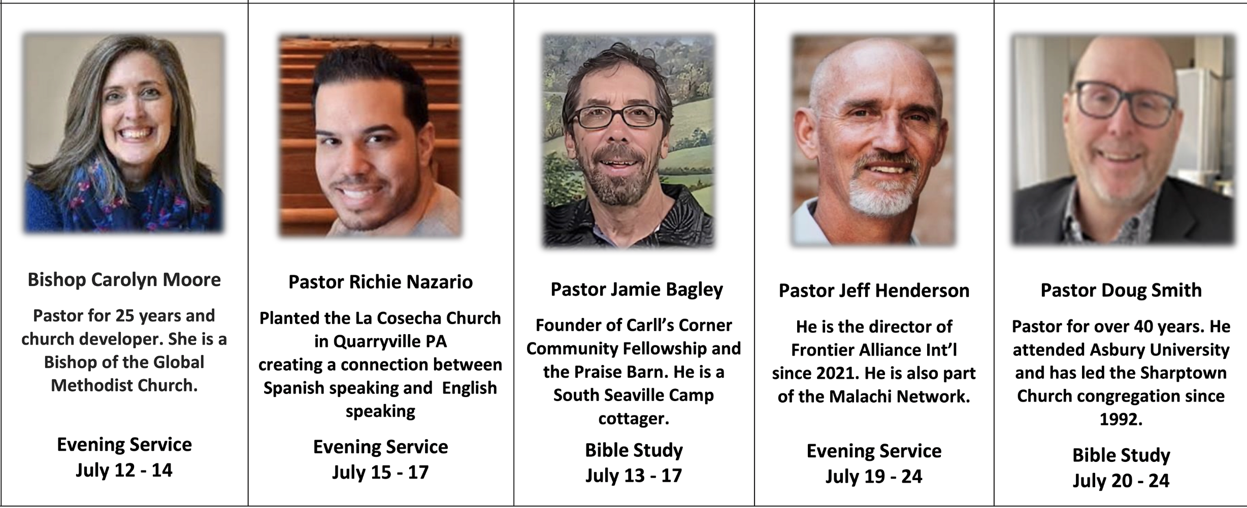 CAMP SCHEDULE FOR 2026 SPEAKERS AND BIBLE STUDY LEADERS Memorial Day Weekend-July 12th July 13-July 26 August and Additional Events